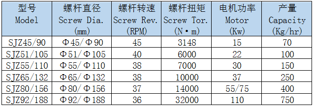 SJSZ系列錐形雙螺桿擠出機(jī)性能穩(wěn)定,能使熔體在較低的溫度下良好塑化擠出,機(jī)筒上裝有鑄鋁加熱器,熱效率高、升溫快而均勻,并配置冷卻風(fēng)機(jī)。專門設(shè)計(jì)的傳動部分,采用新型變頻電機(jī)驅(qū)動或直流電機(jī)驅(qū)動,運(yùn)轉(zhuǎn)平穩(wěn)、傳輸力矩大、效率高。通過進(jìn)口變頻器或直流調(diào)速器能達(dá)到無級平穩(wěn)調(diào)速,精度高、節(jié)能。采用智能化雙顯數(shù)字溫控儀,控制精度高、溫度波動小。設(shè)有過載保護(hù)和故障報(bào)警、螺桿芯部油循環(huán)恒溫、機(jī)筒油冷卻等功能,并裝有真空排氣管裝置和定量喂料裝置。 技術(shù)參數(shù)